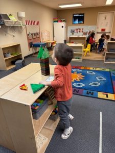 The preschool classroom is designed to meet the social, emotional, developmental, and academic needs of children between the ages of approximately 32 months to 5 years. This classroom maintains a teacher to student ratio of 1:10.